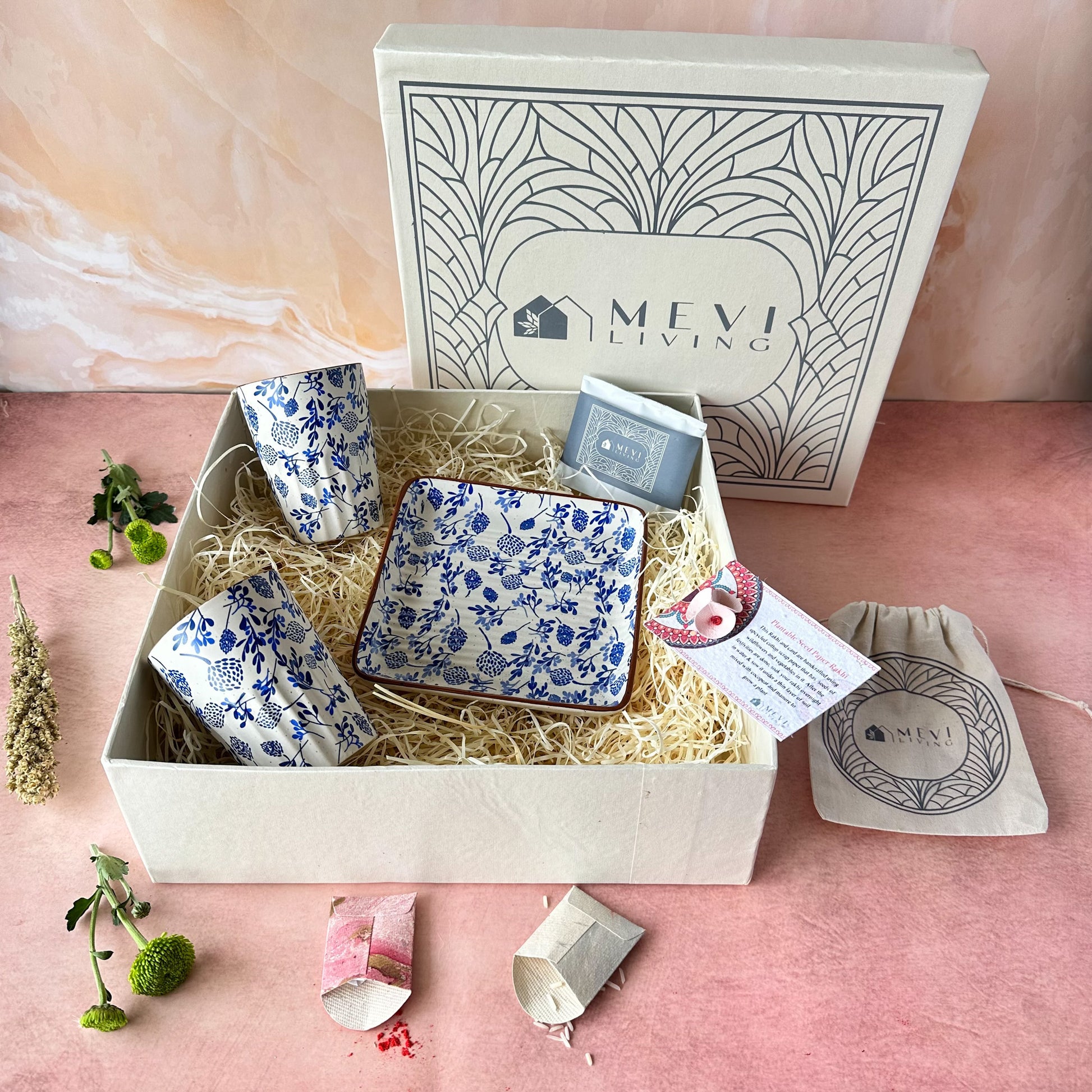 Celebrate Rakhi with a gift that’s rooted in tradition and styled with elegance. The Azure Garden Snack Set features two ceramic kullad glasses and a square snack plate, all adorned with a beautiful blue floral print against a soft ivory base—perfect for chai and savouries.