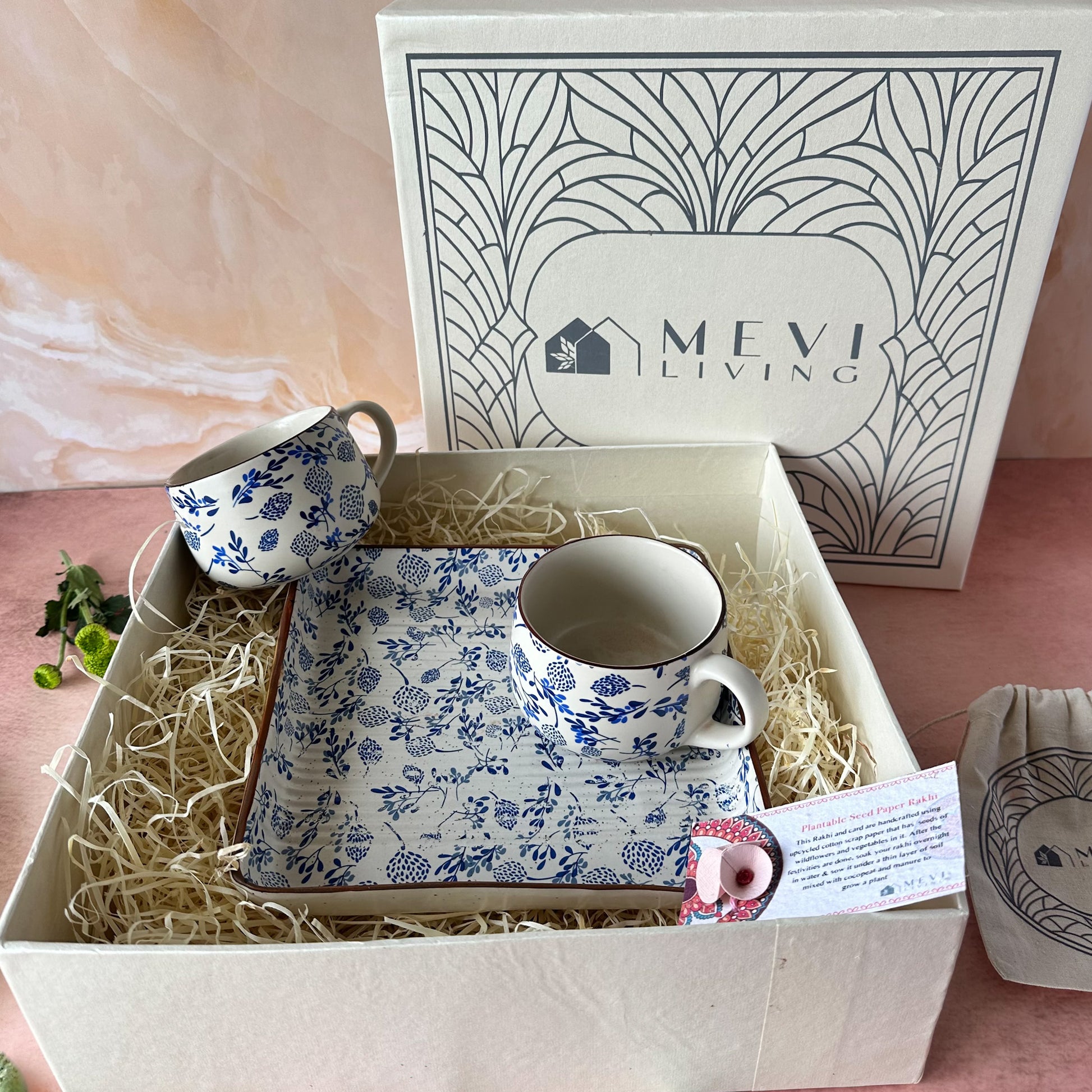 Celebrate Rakhi with a gift that’s both beautiful and thoughtful. This charming hamper includes two ceramic mugs from the Azure Garden collection, each featuring a soft blue floral print against an ivory base. They’re paired with a versatile square ceramic tray, ideal for serving snacks, biscuits, or a shared tea moment.