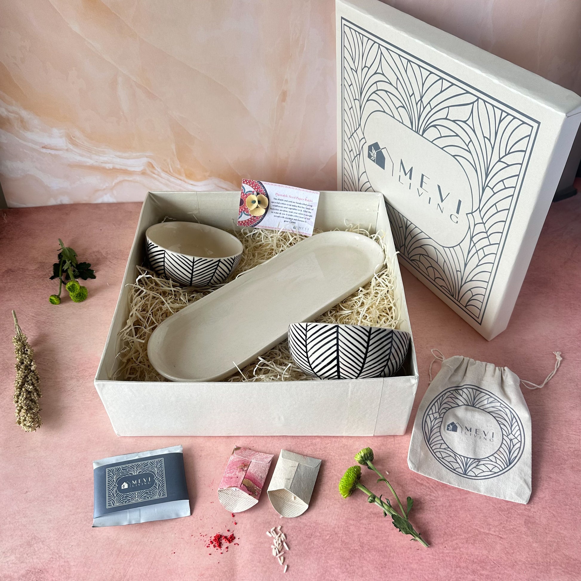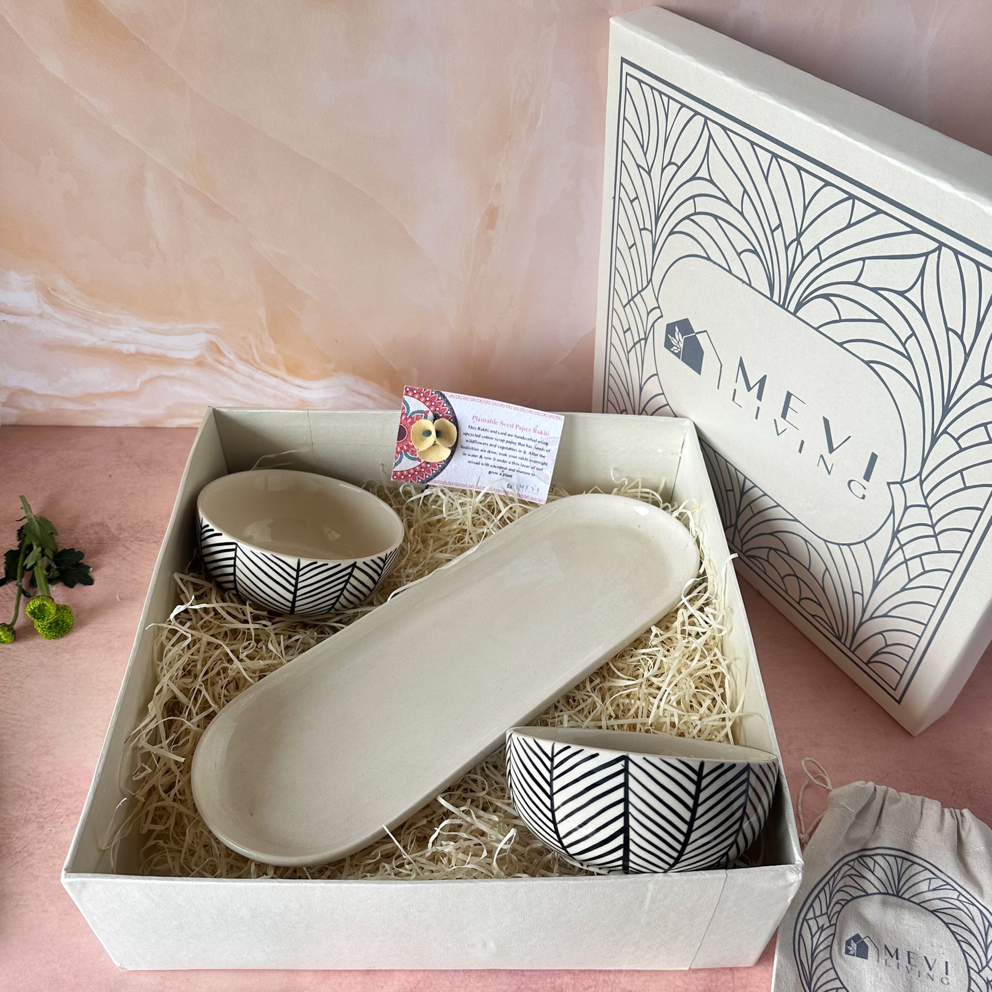Stylish and functional, the Bandeau Bowl Set features two ceramic bowls with bold hand-painted black linework, paired with a sleek off-white tray. With its minimal yet striking design, this set is perfect for serving snacks, munchies or a touch of daily indulgence in elevated form.