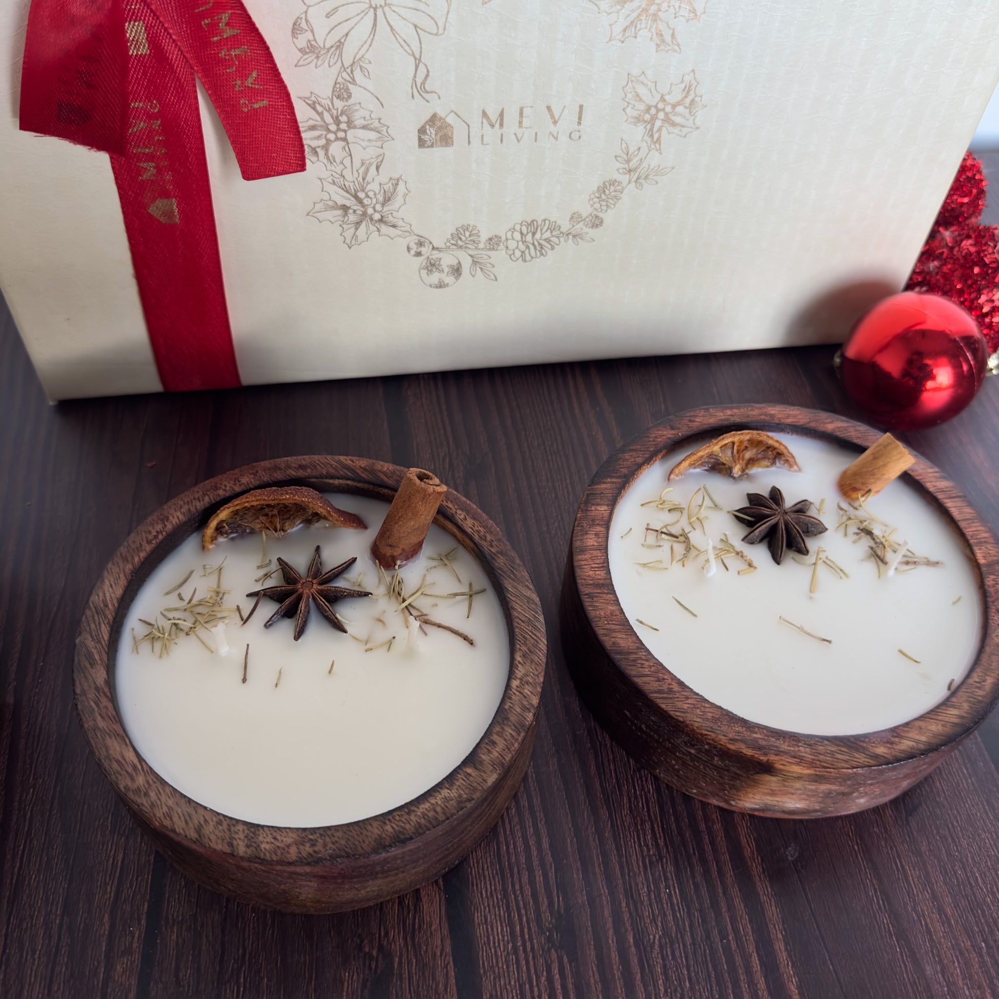 Add a warm, aromatic glow to your winter moments with the Cinnamon Grove Candle Gift Set — a festive duo crafted to fill your home with the comforting essence of Christmas. Featuring two hand-poured two-wick candles set in rustic wooden bowls, each candle is thoughtfully detailed with natural festive elements like star anise and cinnamon bark, adding to its rich, seasonal charm. Infused with the earthy warmth of cinnamon, this set evokes cosy evenings, soft candlelight, and the timeless comfort of the holiday season.