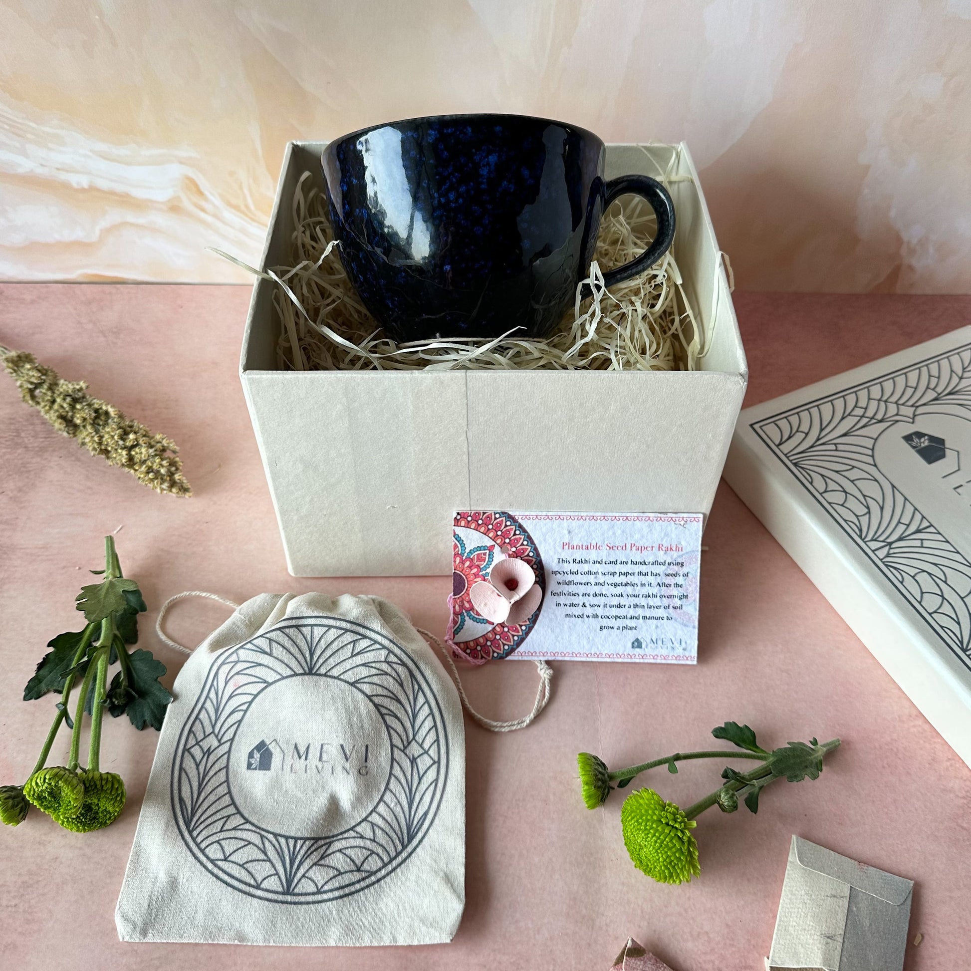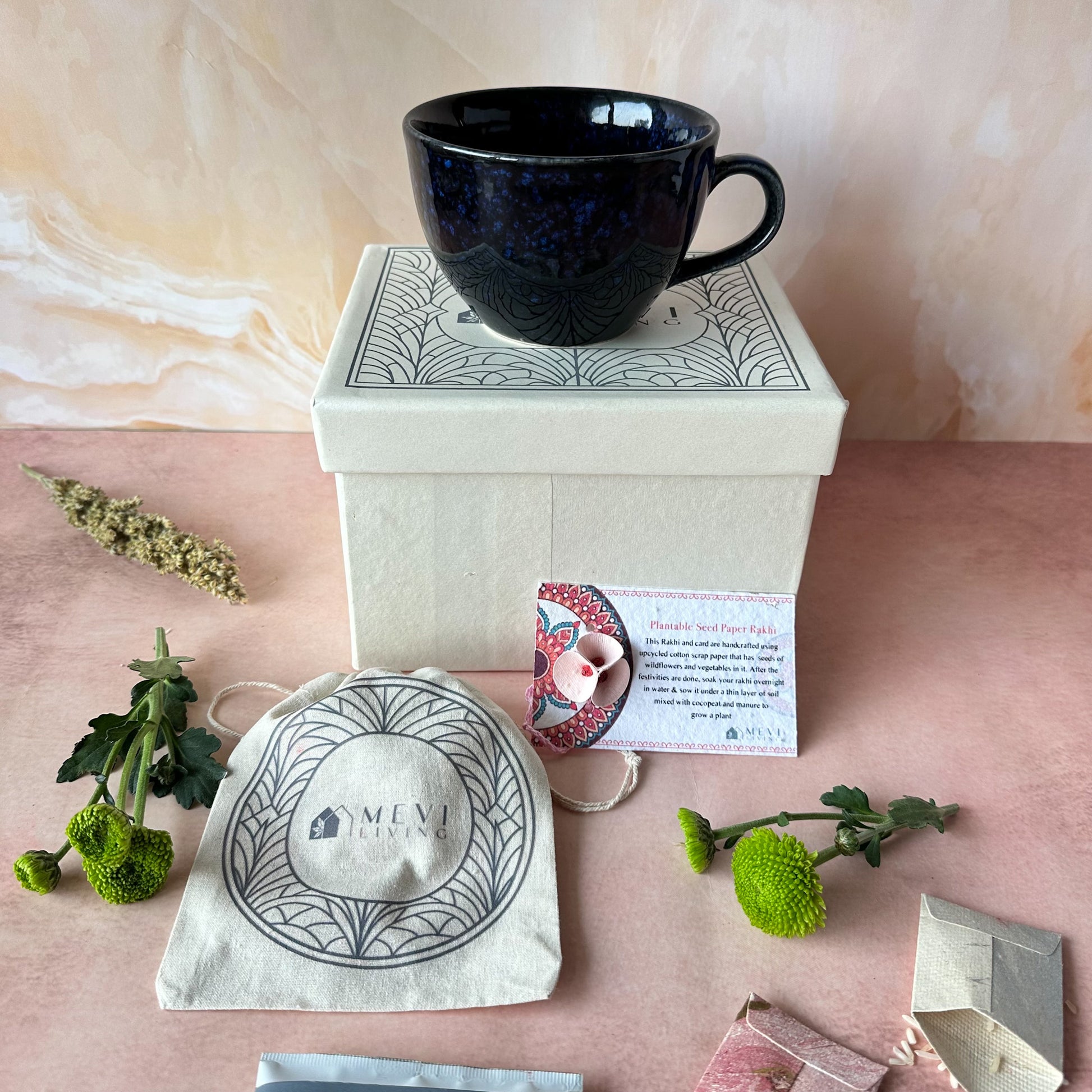 Evoke a sense of wonder this Rakhi with the Cosmic Dream Mug, designed in a deep midnight blue glaze and flecked with celestial speckles. Its rounded silhouette sits beautifully in hand—perfect for your brother’s slow sips and quiet moments.
