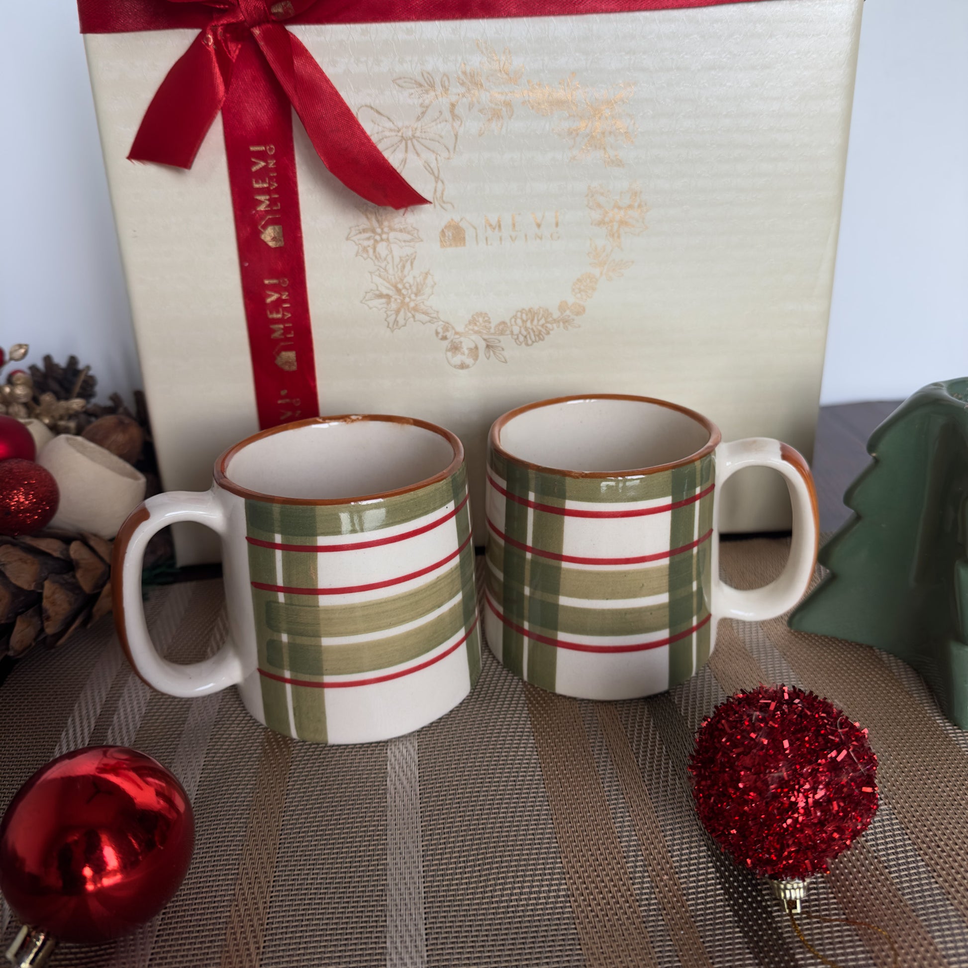 Add a warm, fireside charm to your winter moments with the Holly & Hearth Holiday Gift Set — a thoughtfully curated Christmas ensemble inspired by cosy homes, festive tables, and quiet seasonal rituals. Featuring two ceramic mugs adorned with classic plaid stripes in soothing green and red hues, paired with the sculptural Holly Pine Candle Holder and a Roman Ribbed Pillar Candle, this set is perfect for enjoying morning coffee, evening cocoa, or relaxed winter gatherings.