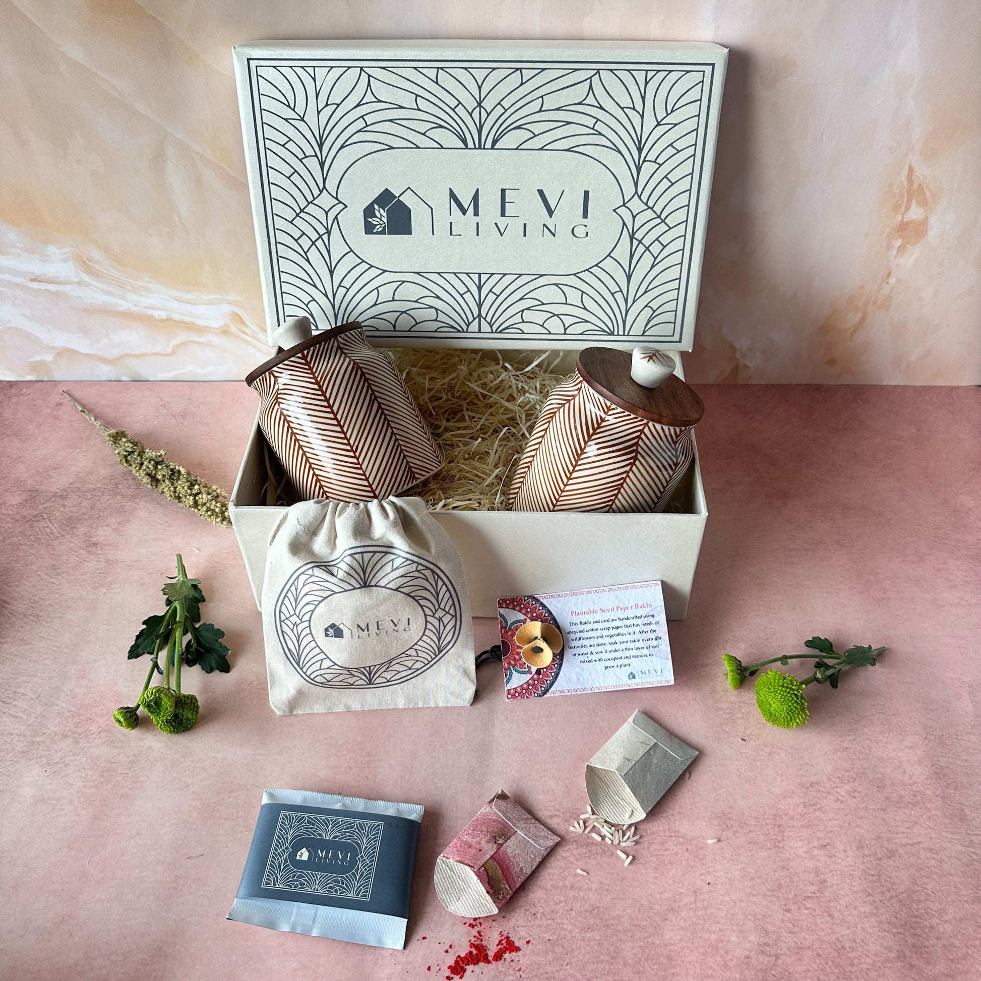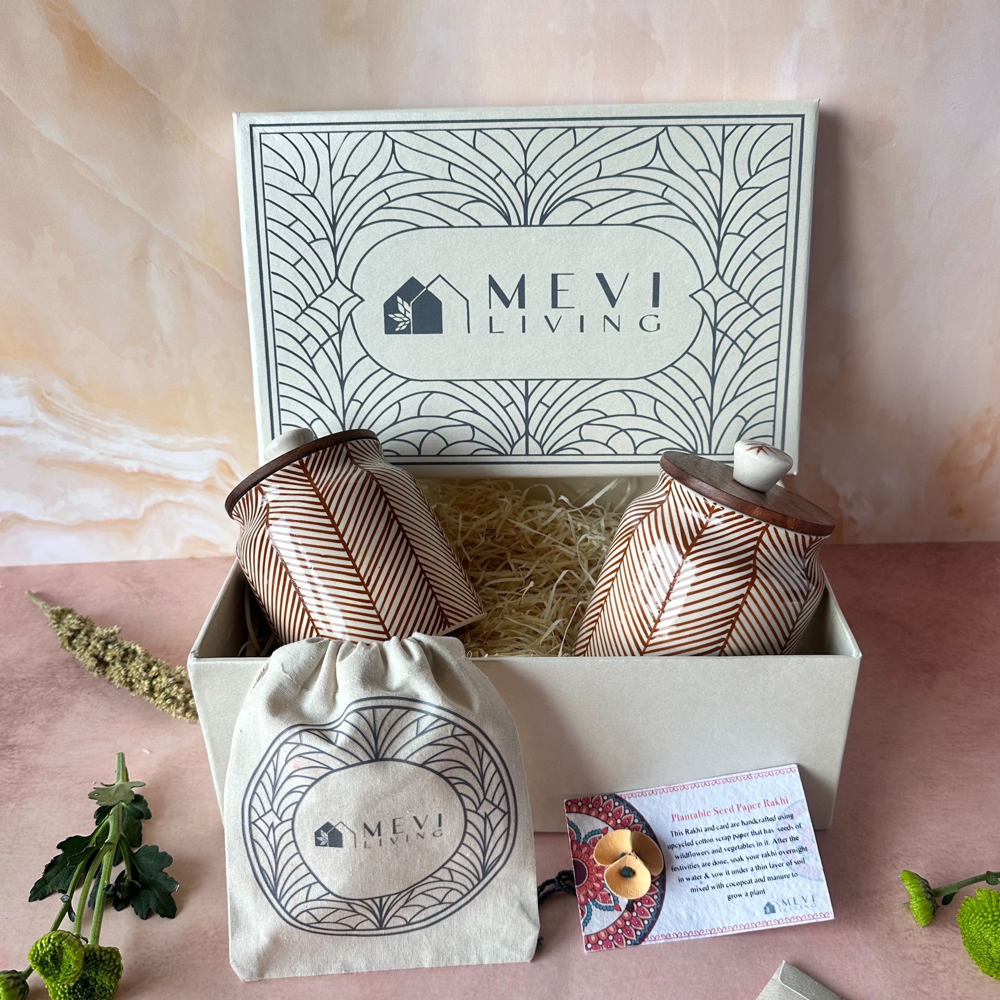 Rooted in warmth and elegance, this Rakhi hamper features two ceramic Imperial Leaf Jars, each showcasing hand-painted rust-toned leaf designs against a soft ivory base. Perfect for storing dry fruits, tea, or everyday essentials, they bring a refined, earthy charm to your brother’s space.