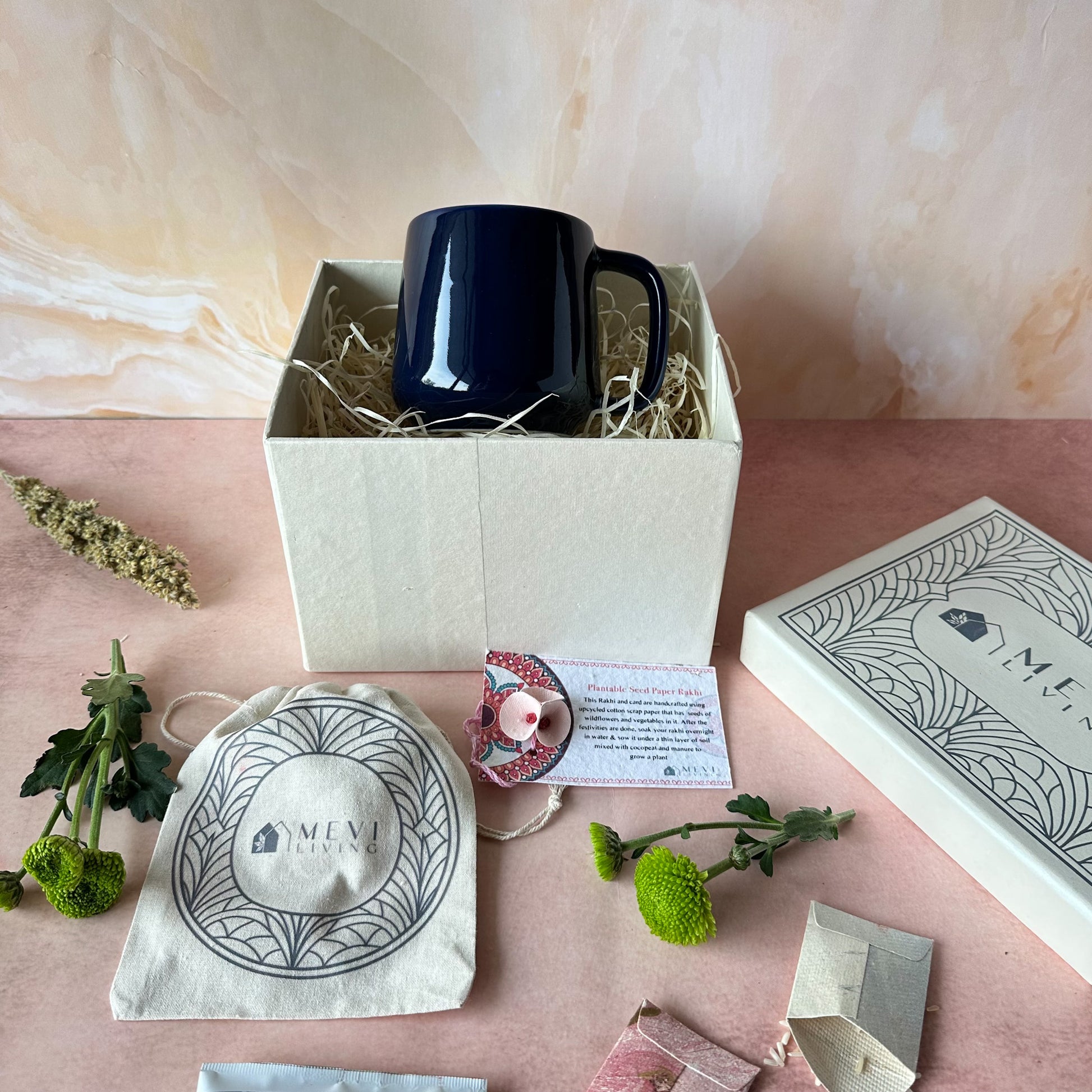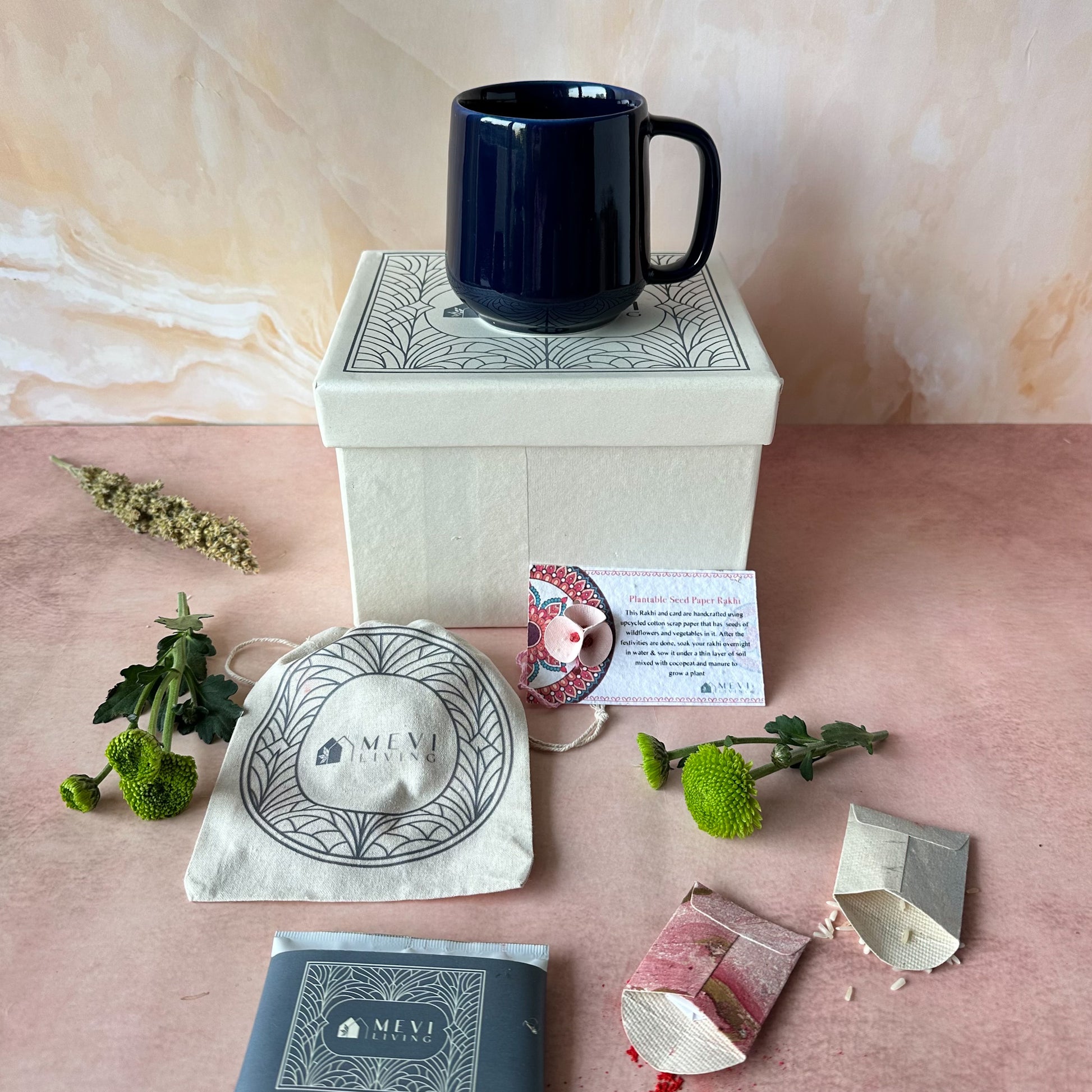 Also included is a Plantable Pansy Rakhi, made from seed paper that grows into wildflowers after the celebration. A handcrafted potli holds the rakhi along with roli and chawal pouches, while an almond chocolate bar completes the hamper with a sweet touch. All neatly packed in an elegant gift box, ready to make Rakhi feel personal and warm.